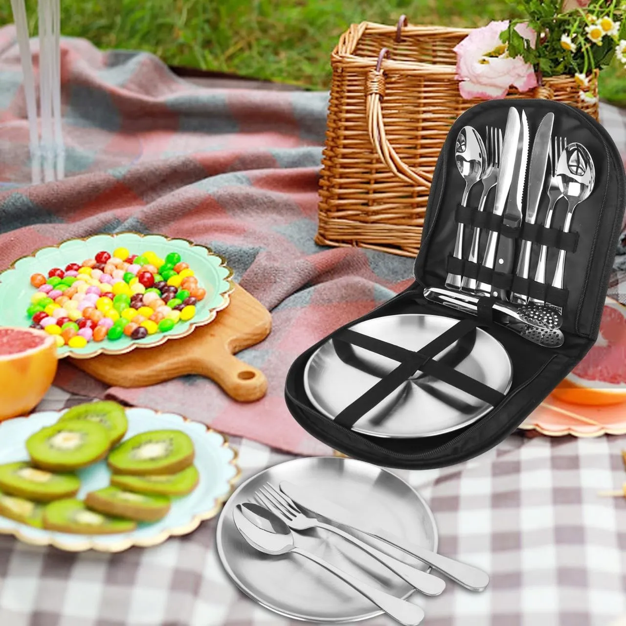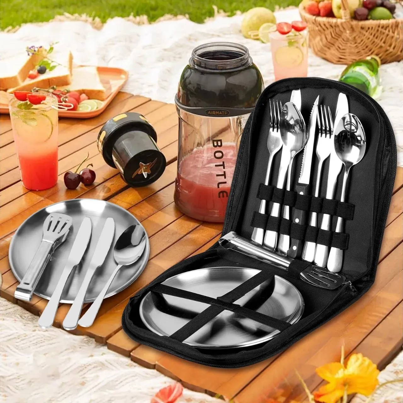دو عدد قاشق و چنگال به ابعاد 21.5 سانتی متر سه عدد کارد به ابعاد 23 سانتی متر دو عدد بشقاب به ابعاد 20 سانتی متر یک عدد انبر به ابعاد 19 سانتی متر