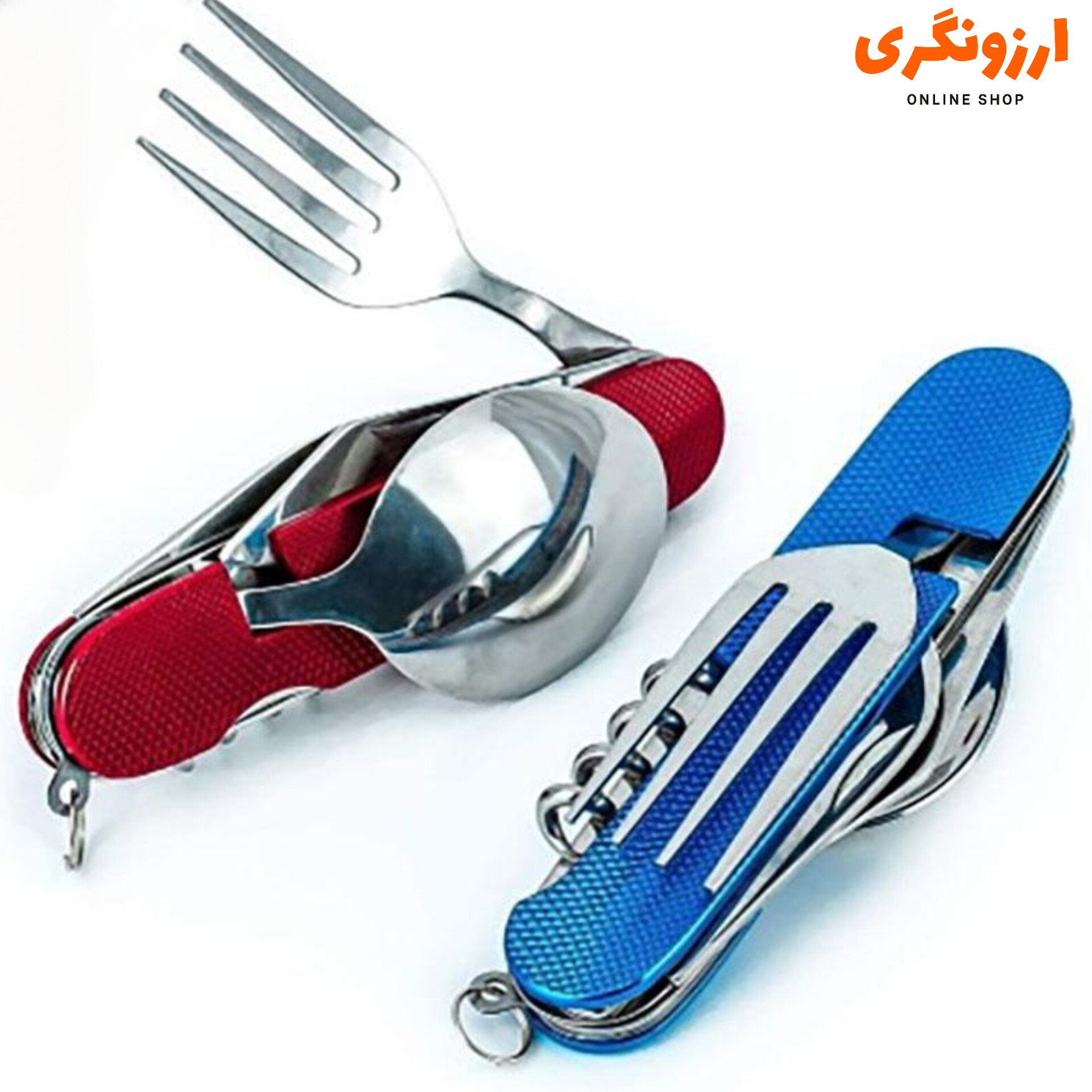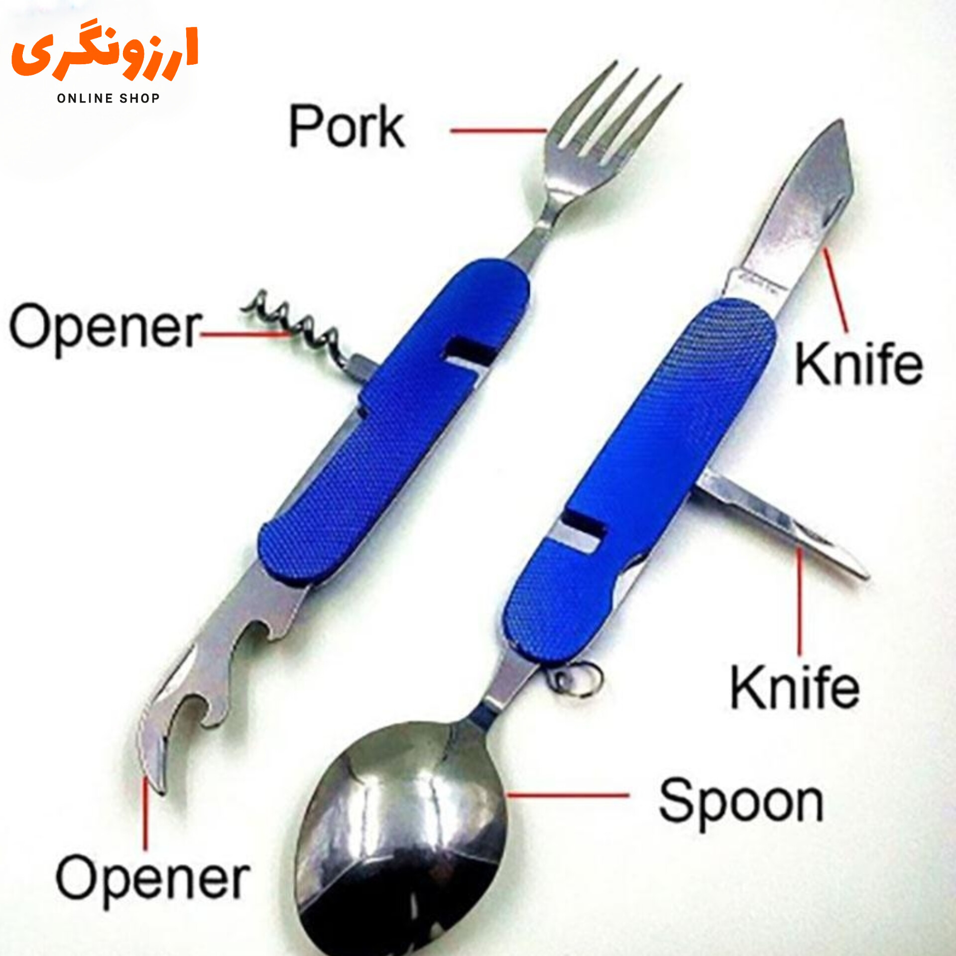 قابلیت جدا شونده و جمع شونده به صورت تاشو جنس استیل ضد زنگ دارای: درب بازکن، چاقو ، بطری بازکن، قوطی بازکن ، چنگال ، قاشق ، چوب پنبه باز کن بسیار کار آمد و قابل حمل