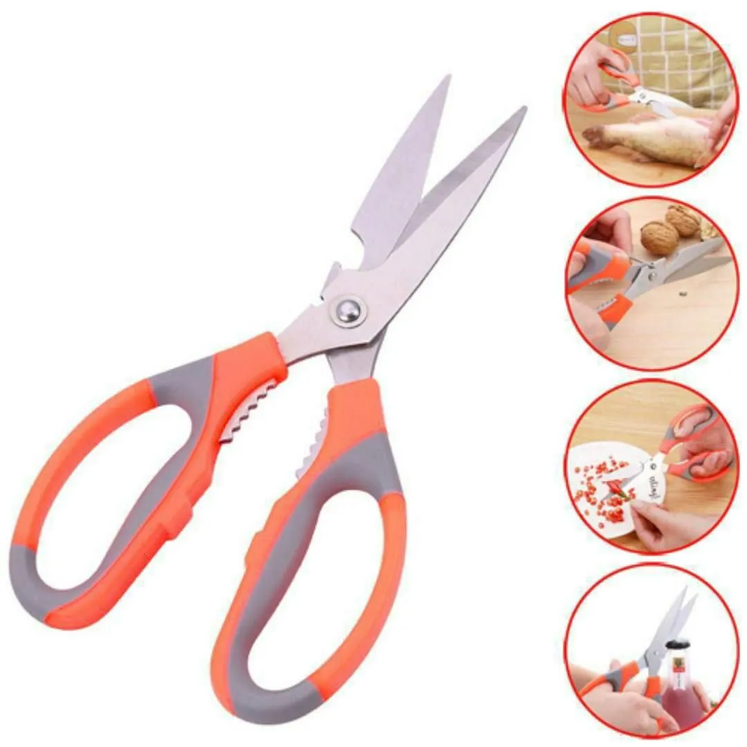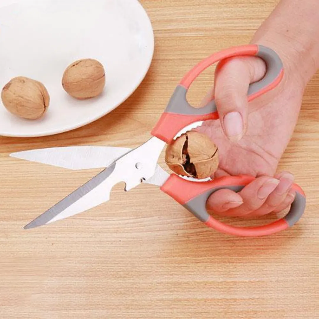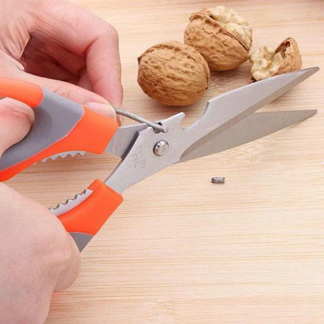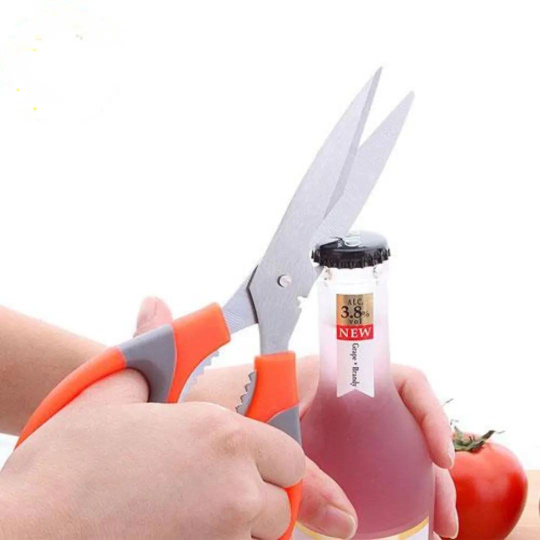 قیچی چند کاره همان طور که از نامش مشخص است یک قیچی است که تیغه های آن از استیل مات تشکیل شده که بسیار تیز هستند و در زمینه های مختلف می توانید از آن استفاده نمایید. دسته های قیچی که توسط آن قیچی را در دست میگیرید از پلاستیک با کیفیت و به صورت استاندارد تهیه شده که هنگام استفاده از آن بسیار راحت هستید. ویژگی دیگر این قیچی دارا بودن قسمت دالبری شکل بین دو دسته ی آن است که می توان از آن برای شکستن گردو و باز کردن درب پیچی نوشابه و دوغ و … استفاده کرد. ویژگی جالب دیگر قیچی این است که یک طرف لبه ی بیرونی قیچی انحنایی وجود دارد که می توان از آن به عنوان درب باز کن هم استفاده کرد.