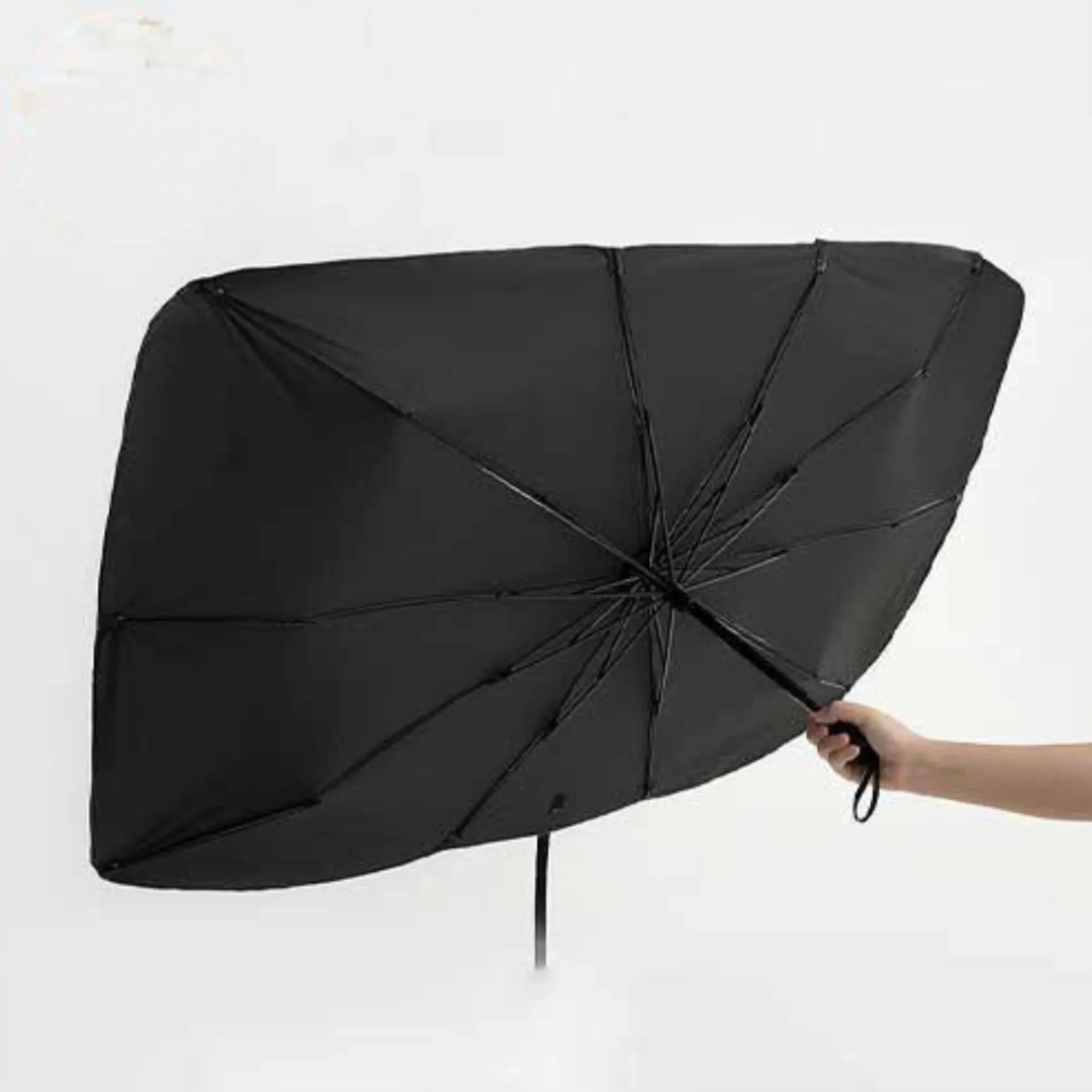آفتابگیر خودرو مدل چتری همانند چترهای معمولی دارای دسته ای با ارتفاع مناسب از جنس پلاستیک می باشد که بالاترین قسمت آن بدنه فلزی نصب شده است و پارچه ای با کیفیت و مقاوم با گیره های به بدنه متصل شده است. دارای ابعادی است ک کاملا روی داشبورد خودرو را می پوشاند و زمانی که به افتابگیر نیاز نداشتید با فشردن دکمه ی روی دسته ی آن اسکلت بالای آن جمع شده و با یک حرکت پارچه و اسکلت بدنه را روی دسته جمع می کنید و با بندی روی آن می بندید. در نهایت محصول به شکل یک چتر در می آید و در کمترین فضا جای می گیرد.