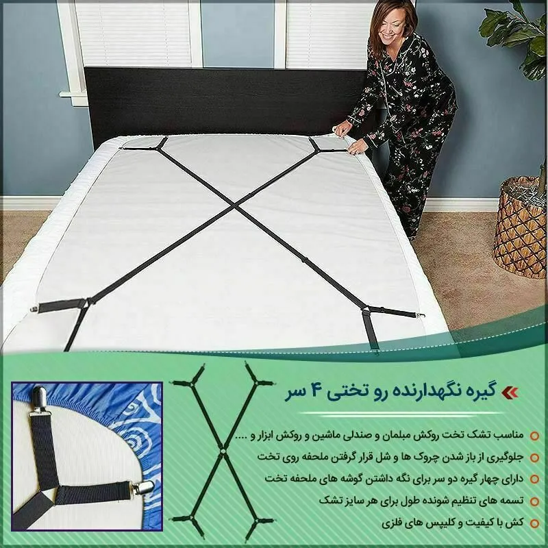 بسته ی گیره ی نگهدارنده ی ملحفه دارای یک گیره ی 4 سر برای نگه داشتن گوشه های ملحفه ی تخت می باشد که ملحفه را از چهار گوشه سفت کشیده و باعث باز شدن چروک ها و شل قرار گرفتن ملحفه روی تخت می باشد. با داشتن این گیره ها دیگر نگران در آمدن ملحفه از روی تخت و یا ظاهر کثیف و نامرتب آن نباشید و بدون زحمت زیاد پس از هربار شستشو آن را در چهارگوشه ی تشک فیکس کنید. با این گیره نگهدارنده، دیگر نگران جمع شدن و یا چروک شدن ملحفه های تخت خود نباشید. این محصول سبک وزن با ابعاد مناسب یکی از نیازهای ضروری هر خانه ای می باشد.این گیره ها از جنس کرومی و مقاوم می باشد که دارای گیره های داخلی پلاستیکی برای جلوگیری از آسیب دیدن پارچه می باشد. این گیره ها از که مرکز آن در وسط تخت بوده و به 4 گوشه ی ملحفه متصل شده و سفت آن را میکشد. همچنین با داشتن تسمه های تنظیم شونده ی طول برای هر سایز تشک و هر سایز ملحفه ای حتی تشک های سفارشی و در هر ابعادی مناسب میباشد.و علاوه بر تشک تخت برای نگه داشتن روکش ابزار و وسایل و…نیز مورد استفاده قرار میگیرد.