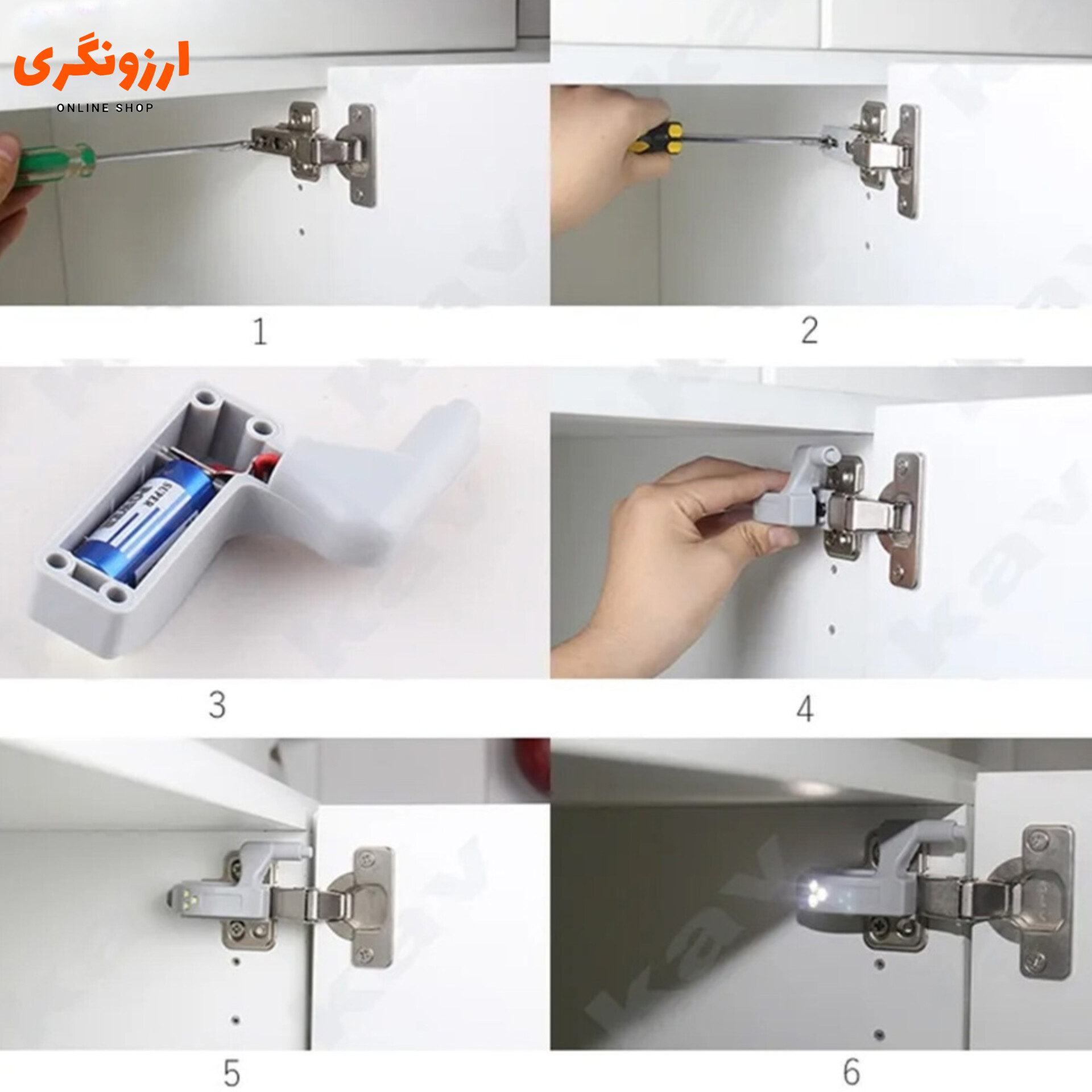 نصب چراغ داخل کابینت بسیار ساده و آسان است و میتوانید به راحتی آن را داخل کابینت یا کمد نصب کنید. لامپ داخل کابینت اشپزخانه دارای یک پایه نگهدارنده است که همراه با خود چراغ در بسته بندی موجود است. در مرحله اول شما باید پیچ داخلی لولای کابینت را باز کنید سپس این پایه نگهدارنده را روی آن قرار دهید و پیچ را روی آن ببندید تا پایه روی لولای کابینت قرار بگیرد. سپس باطری وارد چراغ میکنید و چراغ را روی پایه نگهدارنده قرار میدهید.البته شما میتوانید از این چراغ در انواع کمدهای داخل منزل استفاده نمایید.