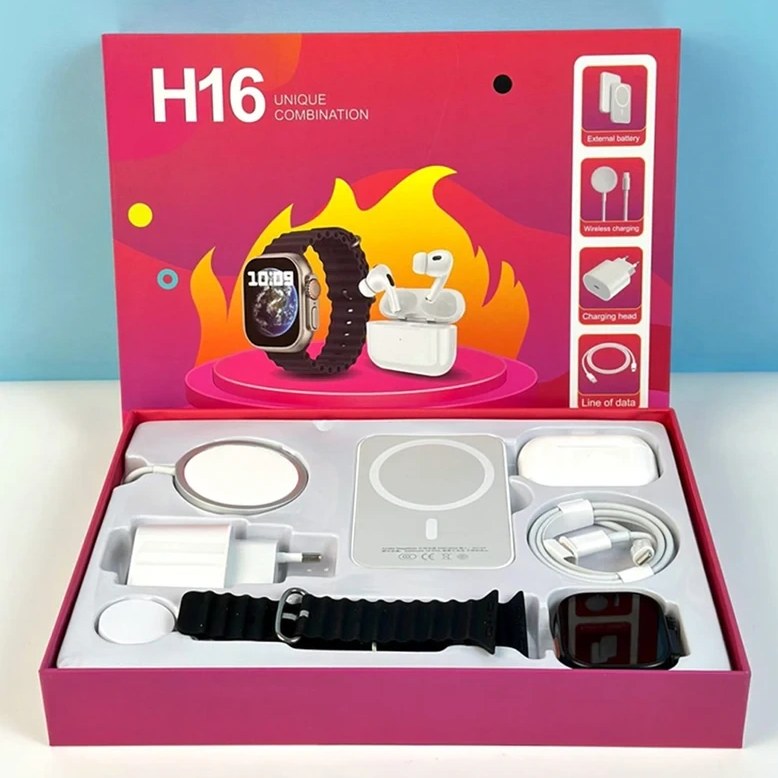 این محصول شامل یک ساعت هوشمند طرح اپل سری اولترا و یه هندزفری بیسیم، طرح ایرپاد اپل هست. این ساعت دقیقا مشابه مدل اولترا اپل هست، اندازه صفحه نمایش 2.02 اینچ ، با پشتیبانی از زبان فارسی ،هر سه دکمه فعال از جمله دکمه مجیک باتن یا چرخشی . مجهز به اسپیکر و میکروفون داخلی و با اتصال به موبایل، علاوه بر مکالمه میتونید به موسیقی مورد علاقهتون گوش کنید. دارای امکاناتی همچون ماشین حساب، کرنومتر، اعلان دریافت و نمایش پیامک هم داره. بند این ساعت مشابه اپل واچ سری اولترا از نوع ocean میباشد. البته باید بدونید که همه نمونههای طرح اپل (از جمله همین مدل) امکان اندازهگیری شاخصهای سلامتی مثل سنسور اکسیژن، ضربان قلب یا فشار خون را ندارند و اعداد نمایش داده شده فقط جنبه دکوری و نمایشی دارد. پک این محصول شامل 1 عدد کابل شارژر, ایرپاد پرو, بند سیلیکونی, پاوربانک وایرلس, شارژر وایرلس, مگ سیف اپل, یک عدد آداپتور میباشد.