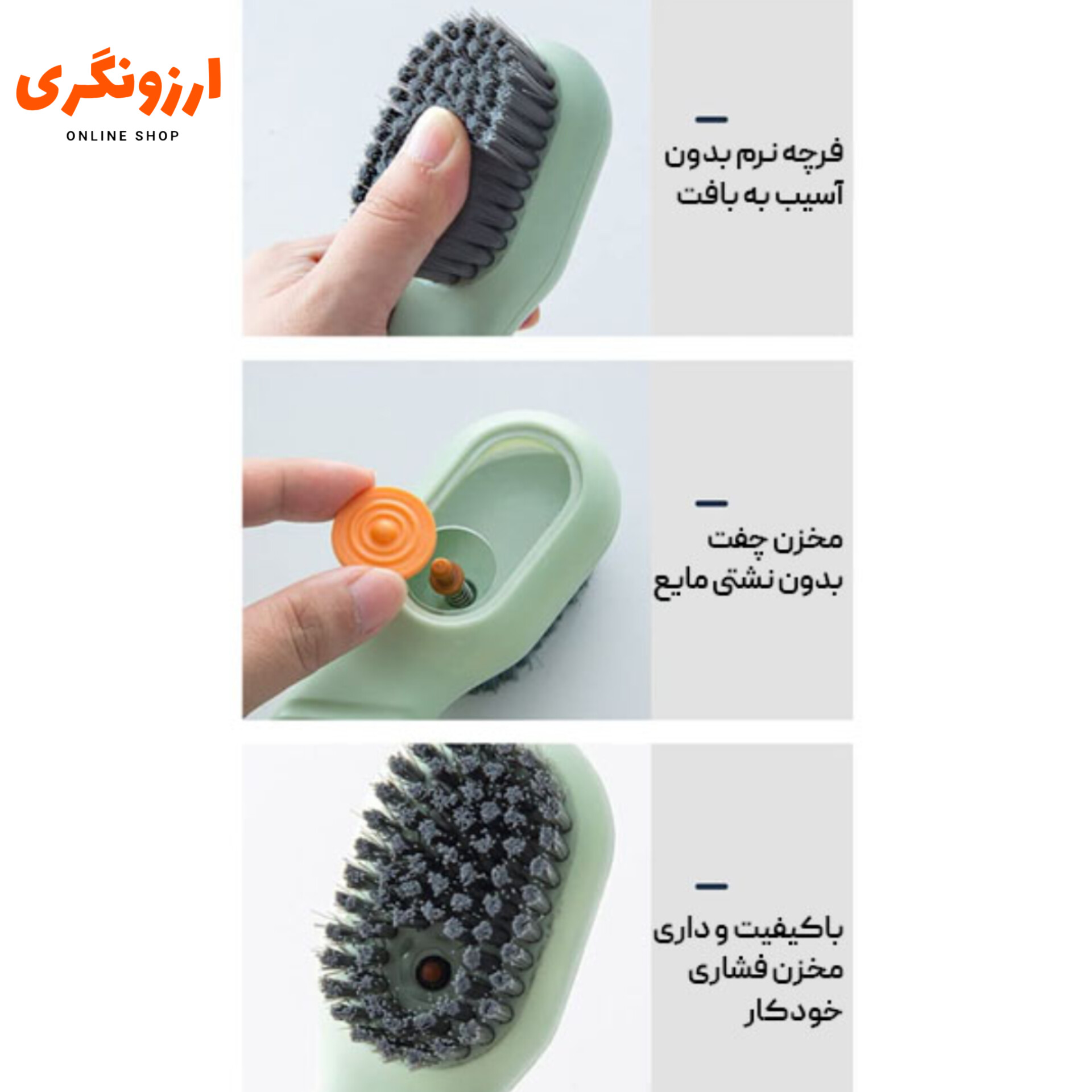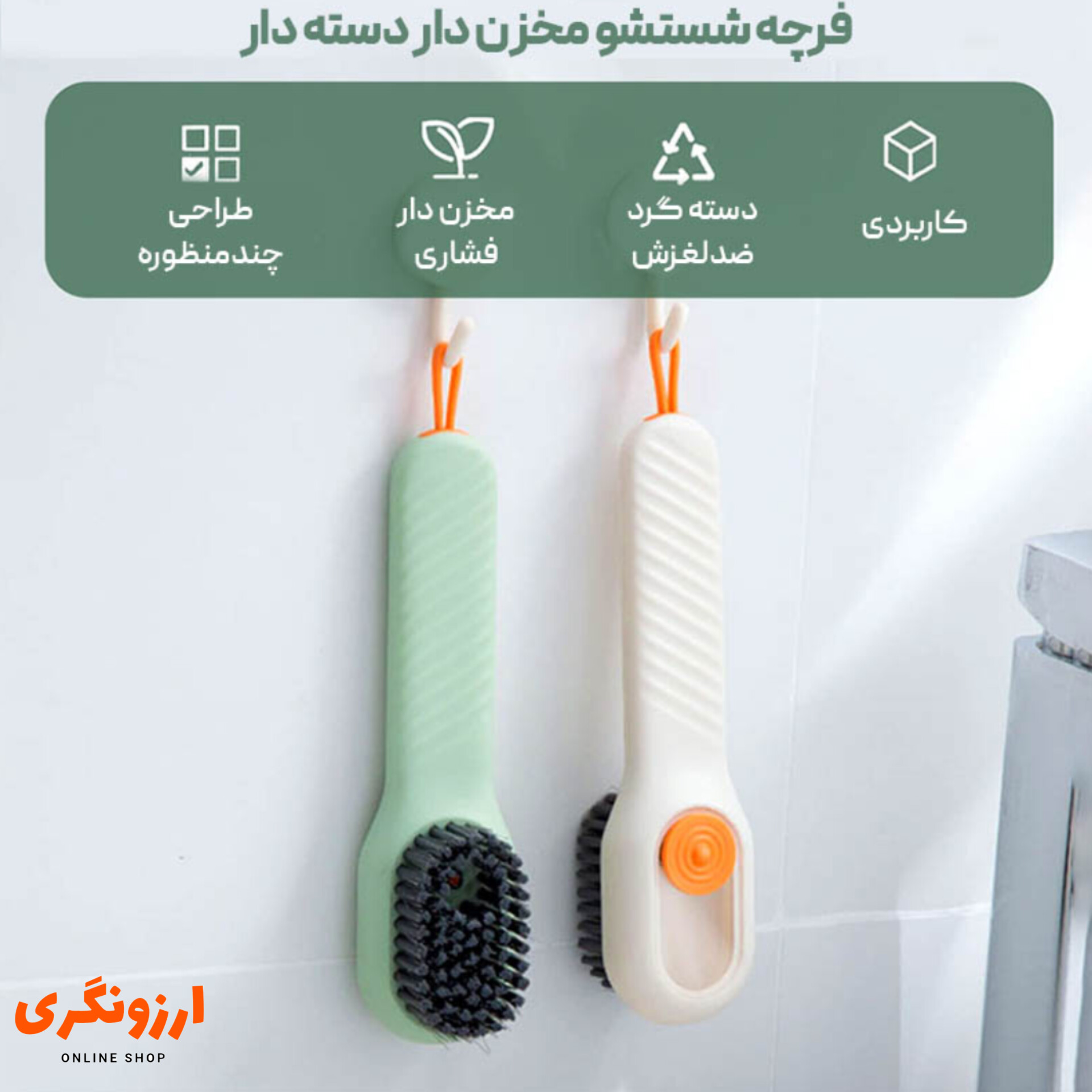 برس شست و شوی مخزن دار ظاهری همانند مسواک دارد. دارای دسته ای پلاستیکی برای در دست گرفتن برس دارد و سری مملو از رشته های نازک پلاستیکی مرغوب با انعطاف مناسب که با حرکت دادن آن می توانید وسایل و لوازمتان را به بهترین شکل نظافت کنید. ویژگی منحصر به فرد برس مخزن دار بودن آن است. در قسمت پایینی سری فرچه مخزن کوچکی قرار داده اند که از قسمت پشت آن شاسی قرار داده اند که با حرکت دادنش درب مخزن باز شده و می توانید مواد شوینده ی مورد نیازتان را درون مخزن بریزید و درب آن را ببندید تا هنگام استفاده مواد شوینده به آرامی به رشته های سری برس منتقل شده و تمیز کردن لوازم را راحت تر می کند. دسته ی آن دارای طراحی ارگونومیک می باشد و هنگام استفاده به دستتان فشاری وارد نمی شود. با توجه به ابعاد مناسب نگهدای از آن فضای زیادی اشغال نمی کند. ظاهر آن به شکلی طراحی شده که برای تمیز کردن لوازم و قسمت های مختلف منزل کاربرد دارد. سری آن از کیفیت بالایی برخوردار است و با استفاده مکرر آسیب نمی بیند.